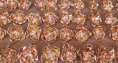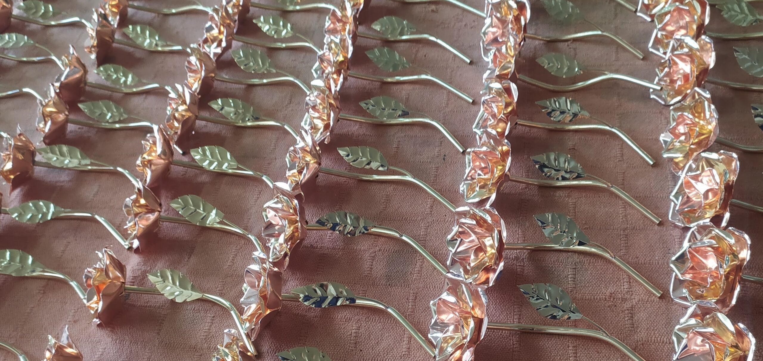 forma de flor, esto se hace a mano con alicate de punta redonda para que queden formas redondeadas. Después se sueldan las hojas al tallo y se pasa al pulido, que se hace por un proceso de vibración. Por último, se aplica un barniz protector para que el aspecto final no varíe con el tiempo.